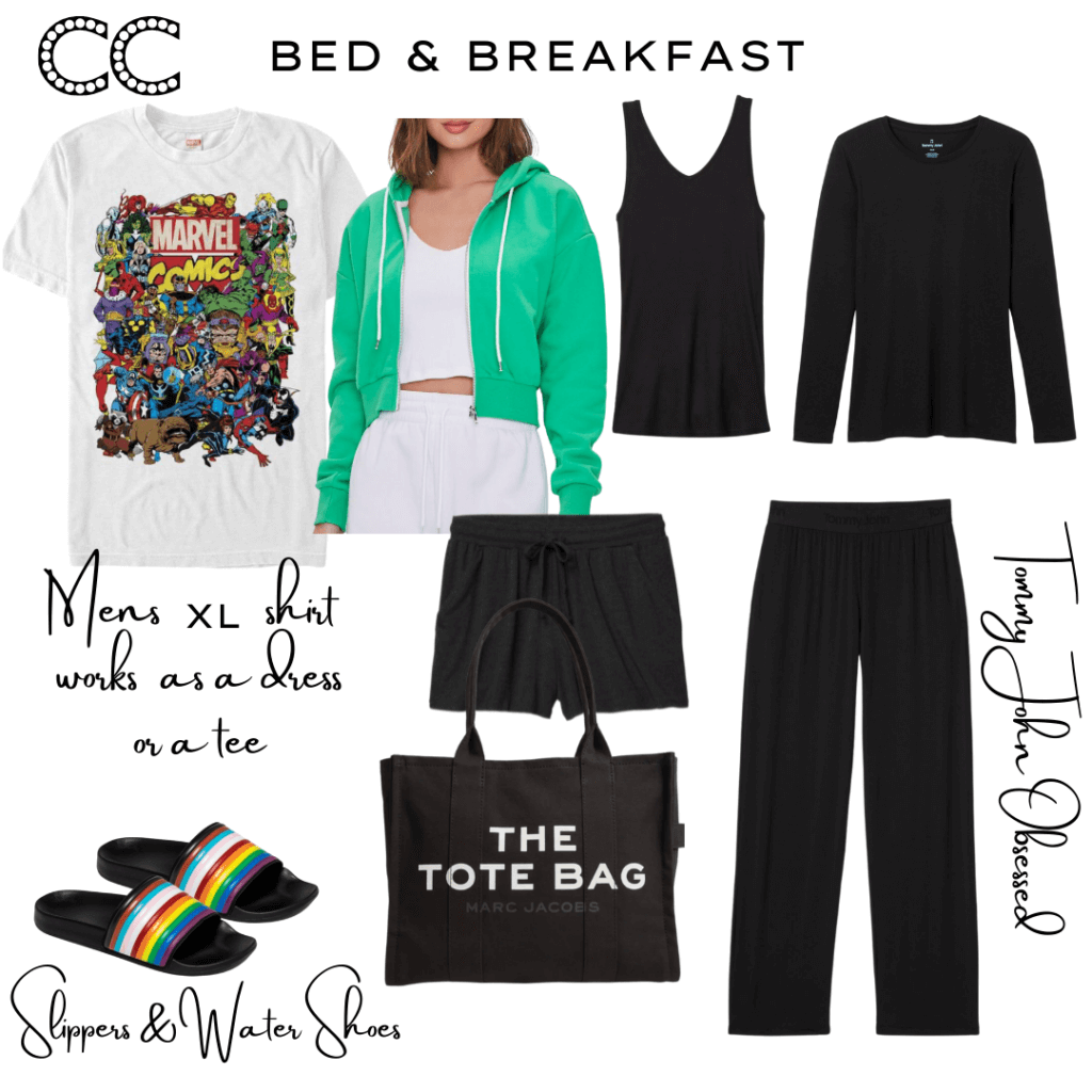 With all these double-duty pieces I’ll have plenty to pick from. Here are just two more outfits you can make with my mix. A graphic tee shirt always manages to make it into my suitcase. This time I’m taking an iconic Van Halen band tee that matches my lavender blazer and an XXL graphic tee shirt that doubles as a sleep shirt or swimsuit cover-up.