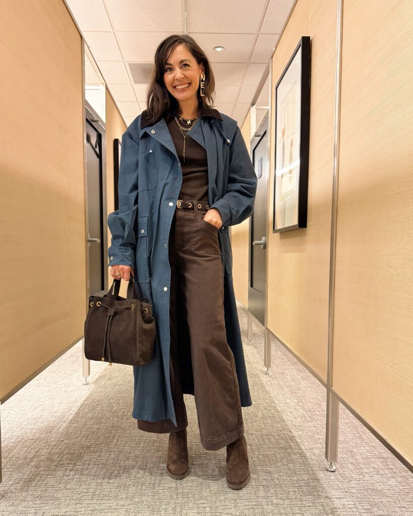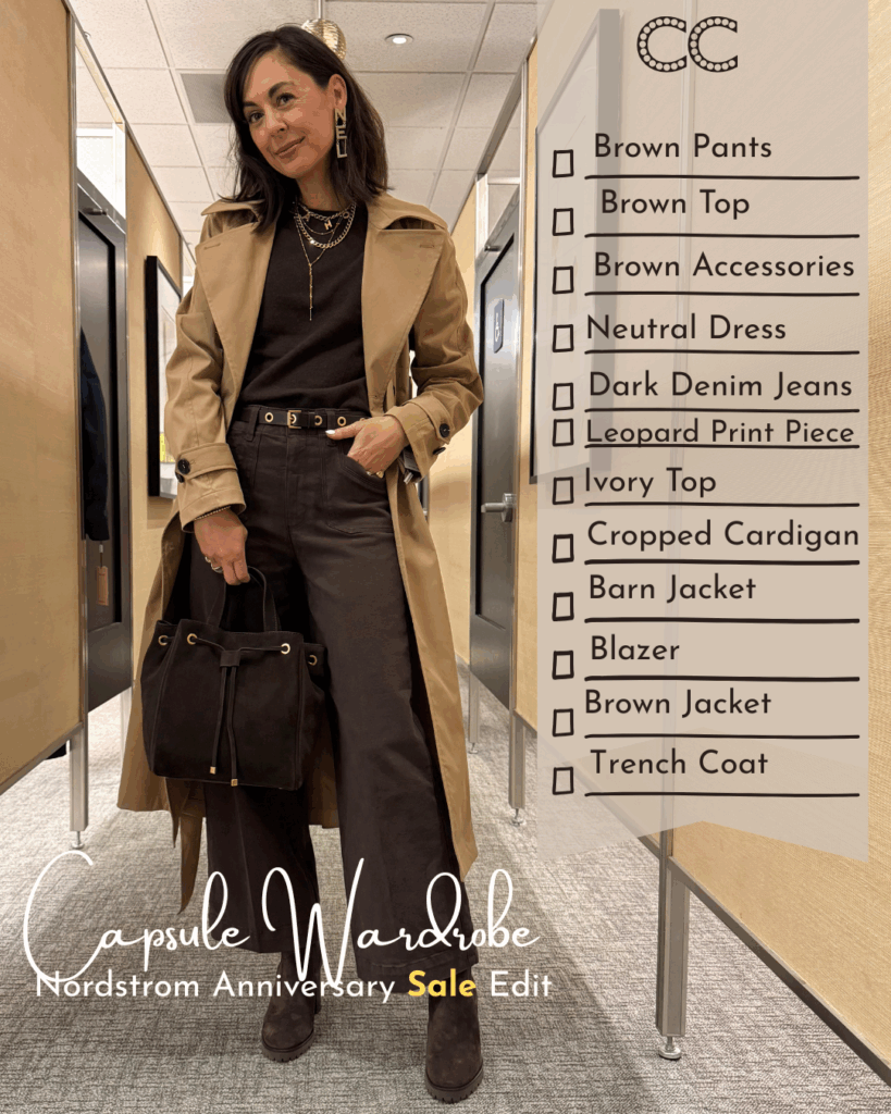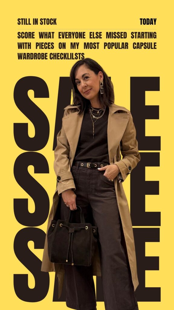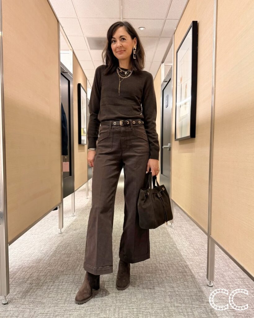 Here are some outfits from two of my most popular sale capsule wardrobes. The jeans and brown cashmere sweater I used to build the brown base I used to make outfits around in this capsule are out of stock, but these bootcut jeans are on sale and still available. They are a universally flattering style that looks best with a bit of heel or boot. The platform boots I’m wearing sold out in most sizes, but I got these with a little lower heel and LOVE them. Most of the simple brown tops and sweaters I chose are sold out, but this Emily in Paris Inspired top is available and my first choice. This capsule isn’t complete without a cool chocolate brown bag and the best styles sold fast. However I have been loving the Italian leather designer inspired bags like this large woven tote and this slouchy suede tote under $150 from Quince.