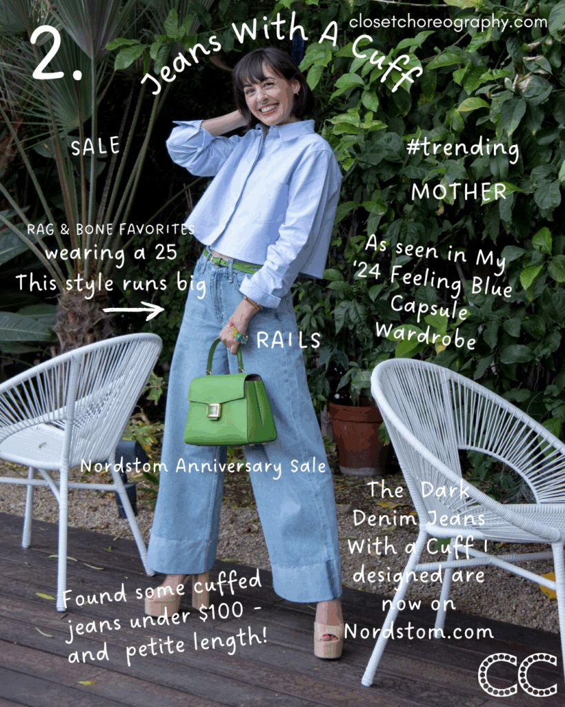 This pair is under $100 and comes in petite lengths. I included this style from Rag & Bone in my Feeling Blue Capsule Wardrobe last spring. They run big, so size down. Choose this cuff style if you prefer a classic, wide-leg jean that isn’t overly stretchy. Mother makes this versatile, light-wash style that can be worn with or without a cuff.