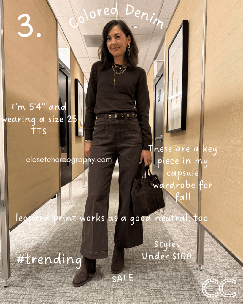 These chocolate brown, wide-leg jeans will sell out quickly. However, leopard print works as a good neutral, too. These are on sale for under $100, and so is this long, wide leg style, but it runs big. FRAME’s best-selling slim palazzo in this pretty olive grove color is on sale now, too.