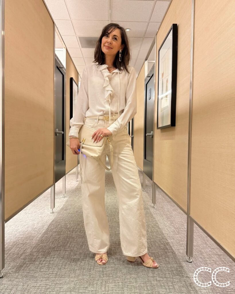 This head-to-toe ivory outfit anchor is the best base for a capsule wardrobe you can start wearing right now. I tried dozens of ivory jeans to find the most flattering fits, and these 3 are my favorite. This pair from AG is 50% off. There are plenty of pretty ivory tops on sale and in stock, including the one I’m wearing, this one I just ordered, and this one from Veronica Beard.