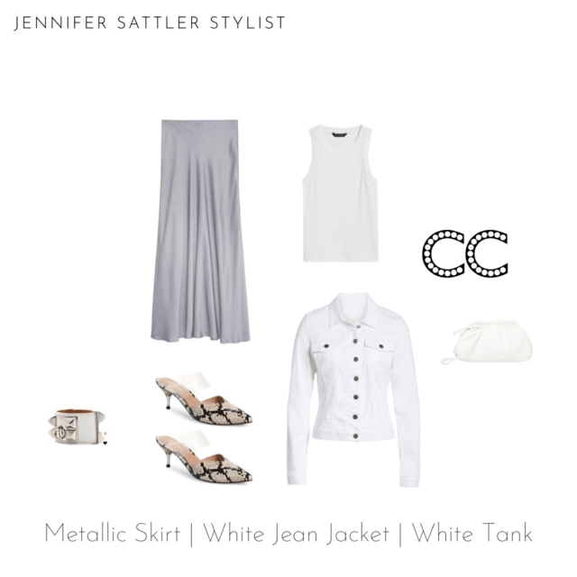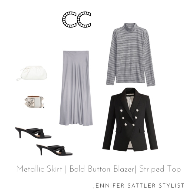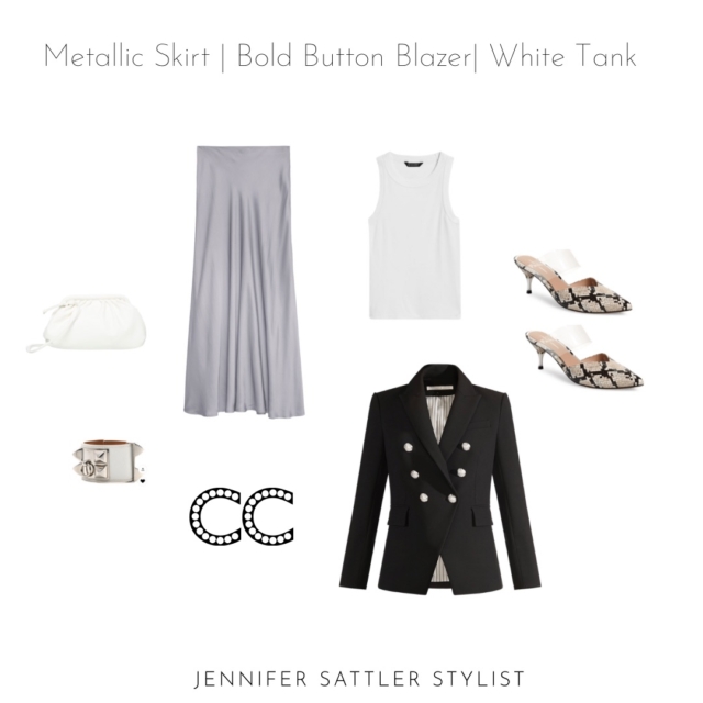 A metallic skirt will be the best new non-boring basic item in your capsule wardrobe. Metallic fashion separates are fashionable and fun, day or night. Since street-style metallics are neutral, a gold or silver skirt will be easy for you to mix and match. The one I’m wearing is under $30! See how a simple slip skirt can be transformational to your wardrobe in my post-Simple Slip Skirt Street Style Outfit Ideas.