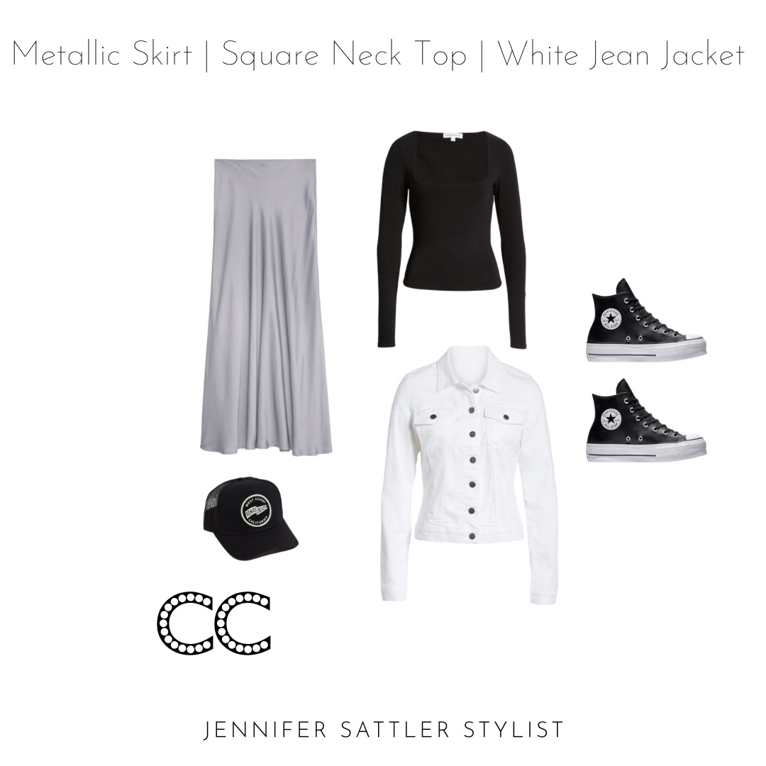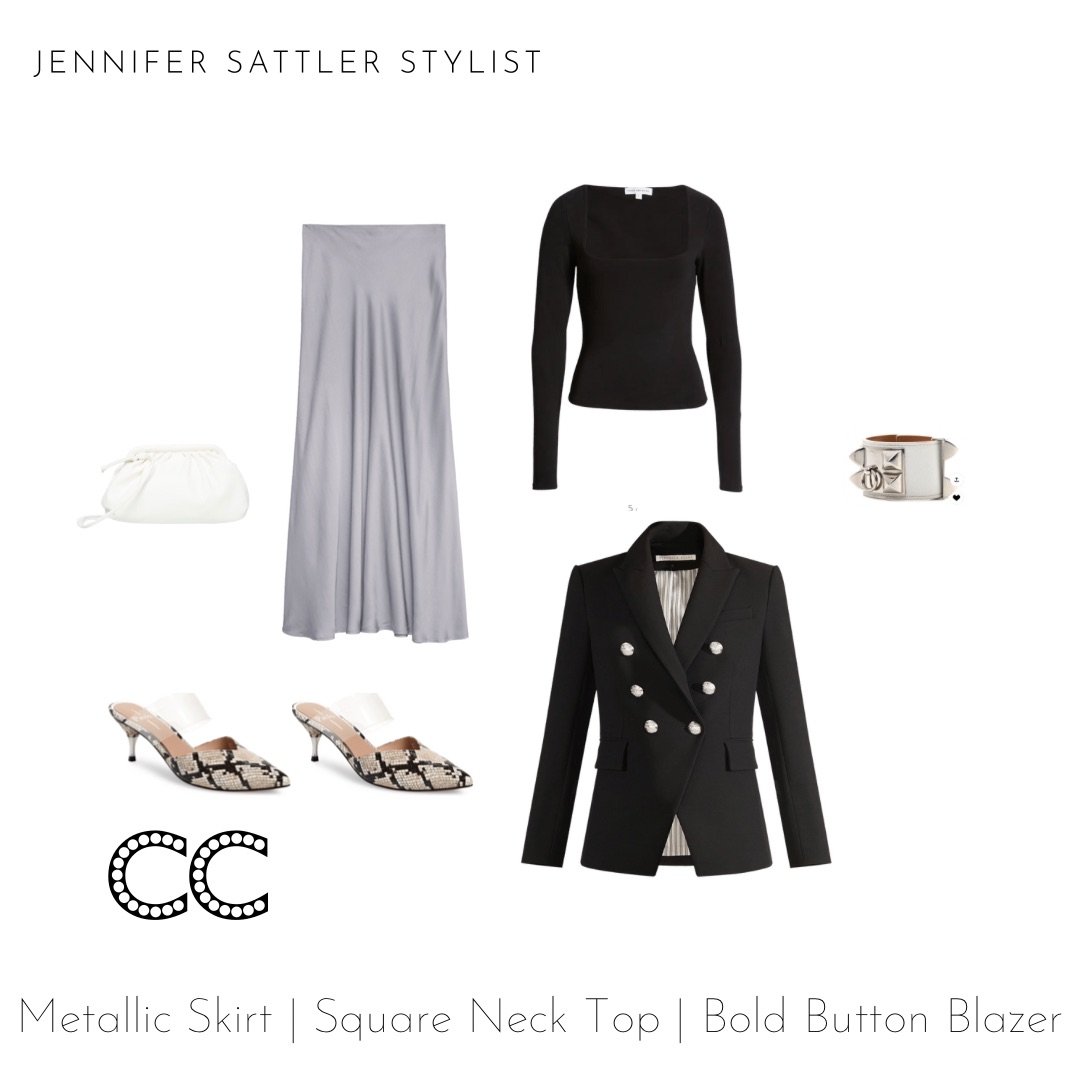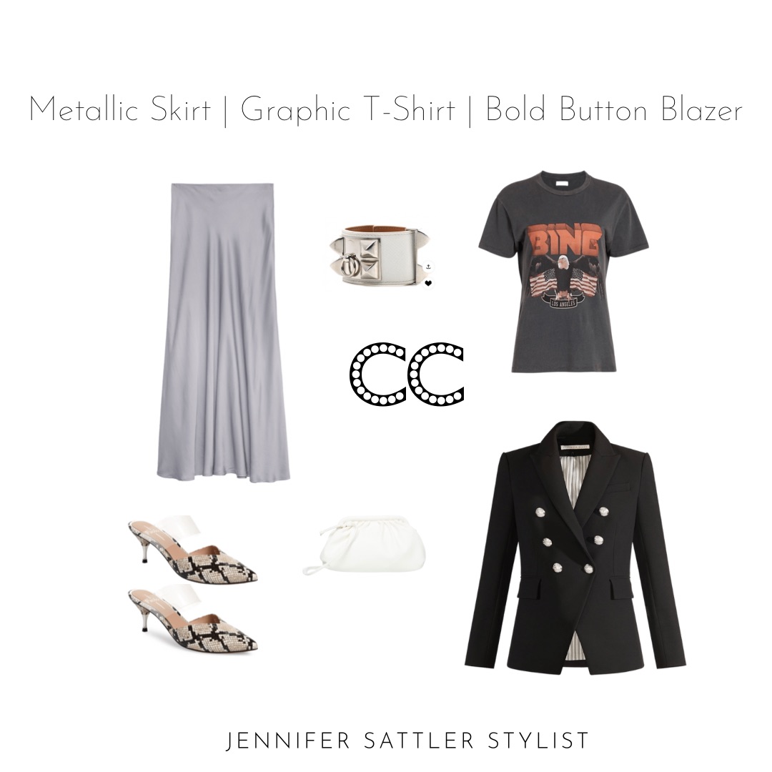 A metallic skirt will be the best new non-boring basic item in your capsule wardrobe. Metallic fashion separates are fashionable and fun, day or night. Since street-style metallics are neutral, a gold or silver skirt will be easy for you to mix and match. The one I’m wearing is under $30! See how a simple slip skirt can be transformational to your wardrobe in my post-Simple Slip Skirt Street Style Outfit Ideas.