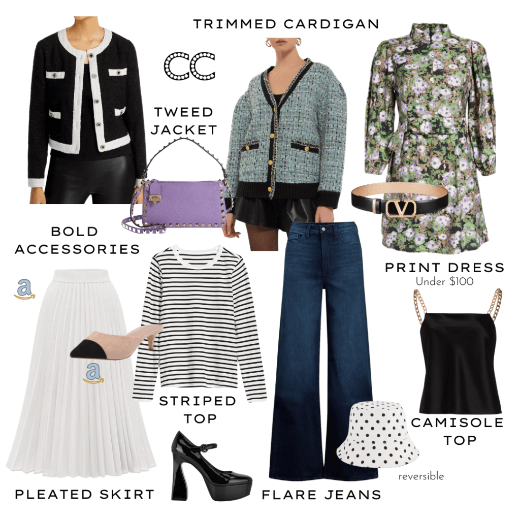 It helps if the patterns are opposite in the sale. For example, a thin striped tank top with a wide striped cardigan or striped trim jacket, as seen in my Emily in Paris Capsules.