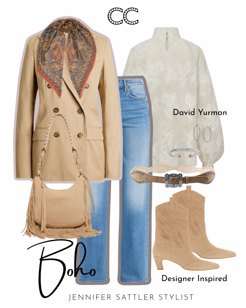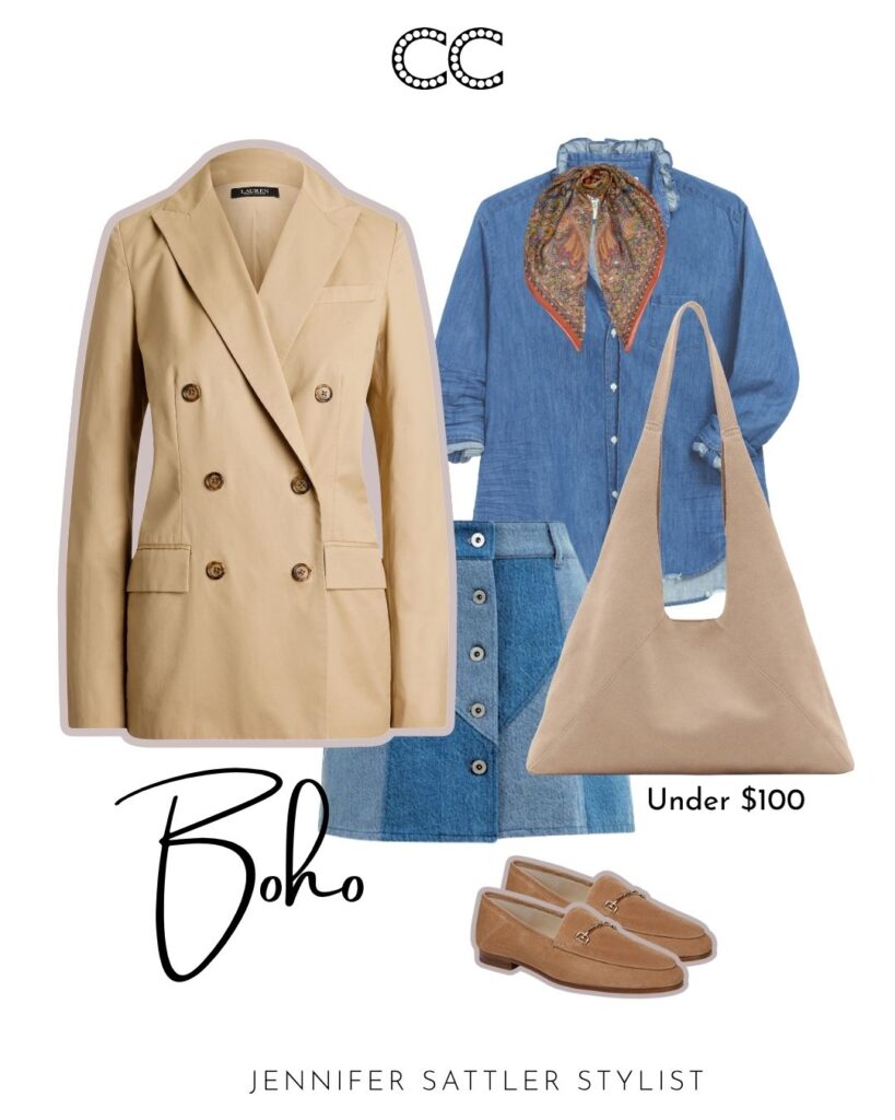 This classic khaki double-breasted blazer checks all the boxes. High end designers like Celine are walking this silhoutte down the runway and celebs like Ann Hathaway are giving this classic style a fresh look.