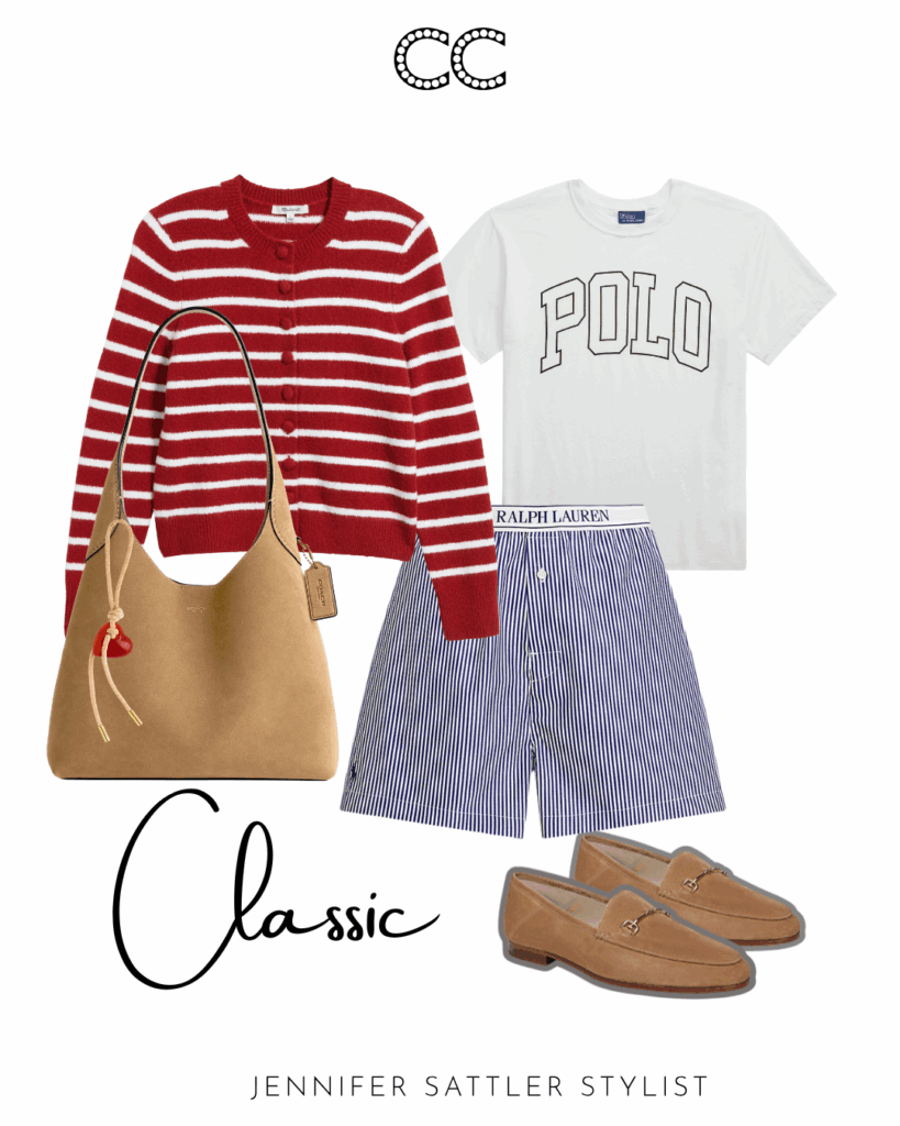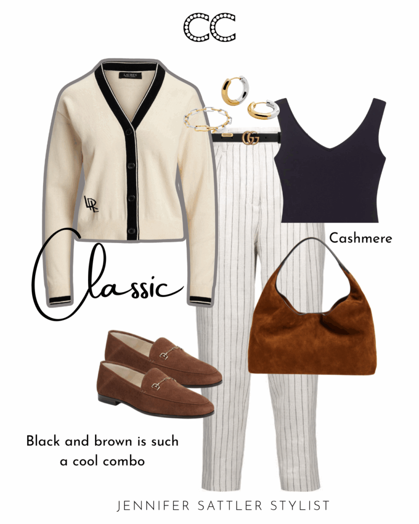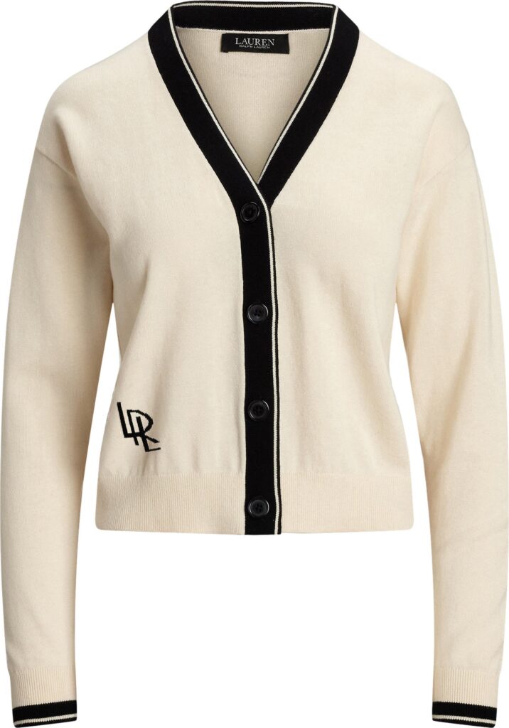 I love the movement and interest a tipped or trimmed cardigan adds to an outfit. This ivory and black classic cotton style from Ralph Lauren is timeless and chic!
