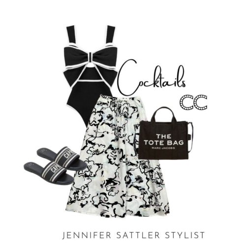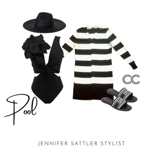 A black and white dress is the hero here. She’s so fun you may want more than one! Choose a style that is easy to dress up for dinner or down for a day sightseeing or relaxing in your cabana.