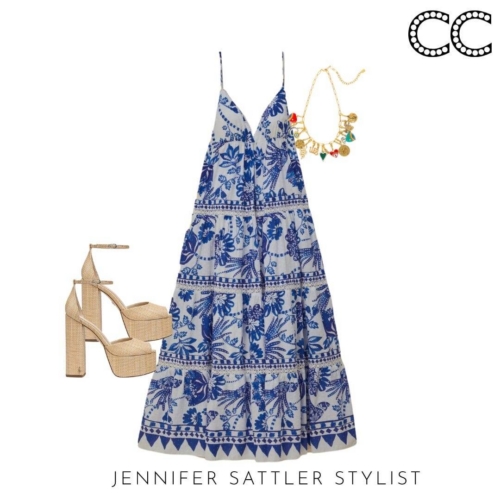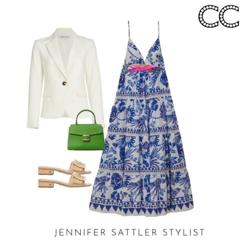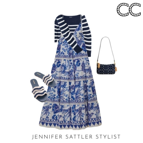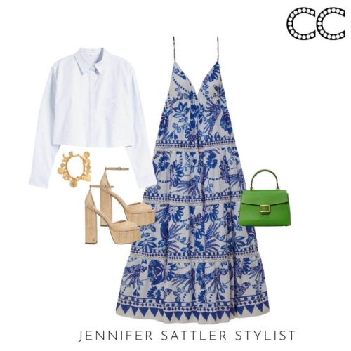 A blue and white print dress was my inspiration for this capsule. There are so many versions that are easy to style and wear to a graduation, wedding, church, shopping, or your next vacation. I showed how a blue and white print dress also plays well with other prints in my 2023 Emily in Paris Capsule.