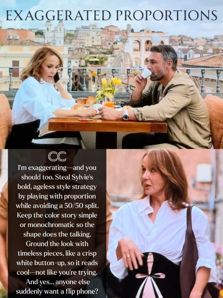 I’m exaggerating—and you should too. Steal Sylvie’s bold, ageless style strategy by playing with proportion while avoiding a 50/50 split. Keep the color story simple or monochromatic so the shape does the talking. Ground the look with timeless pieces, like a crisp white button-up, so it reads cool—not like you’re trying.