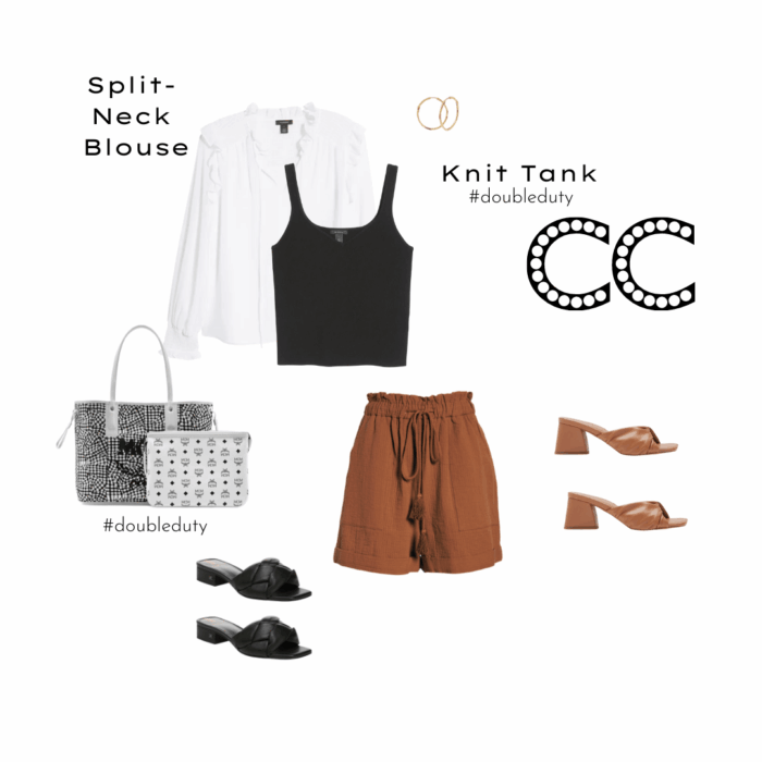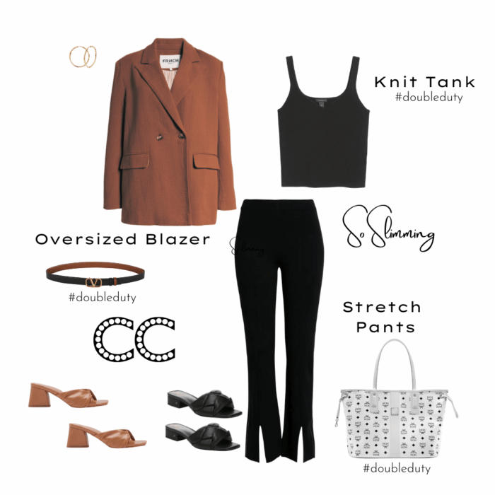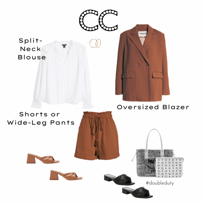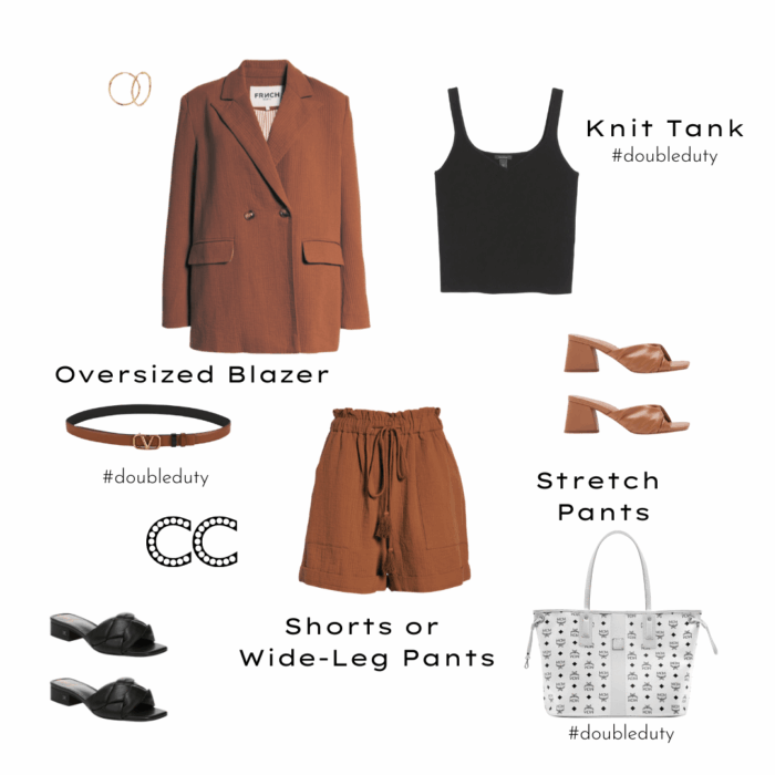 work capsule wardrobe style board with oversized blazer a split neck blouse reversible belt tote shirtdrss stretch pants shoes ow heel shoes open toe sandals knit tank dressy shorts