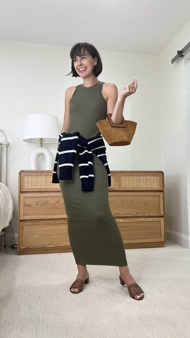 This olive green color is classic and will work with light layers over it into the fall. It feels like pajamas but the double-lined style and subtle ribbed texture make it so flattering.