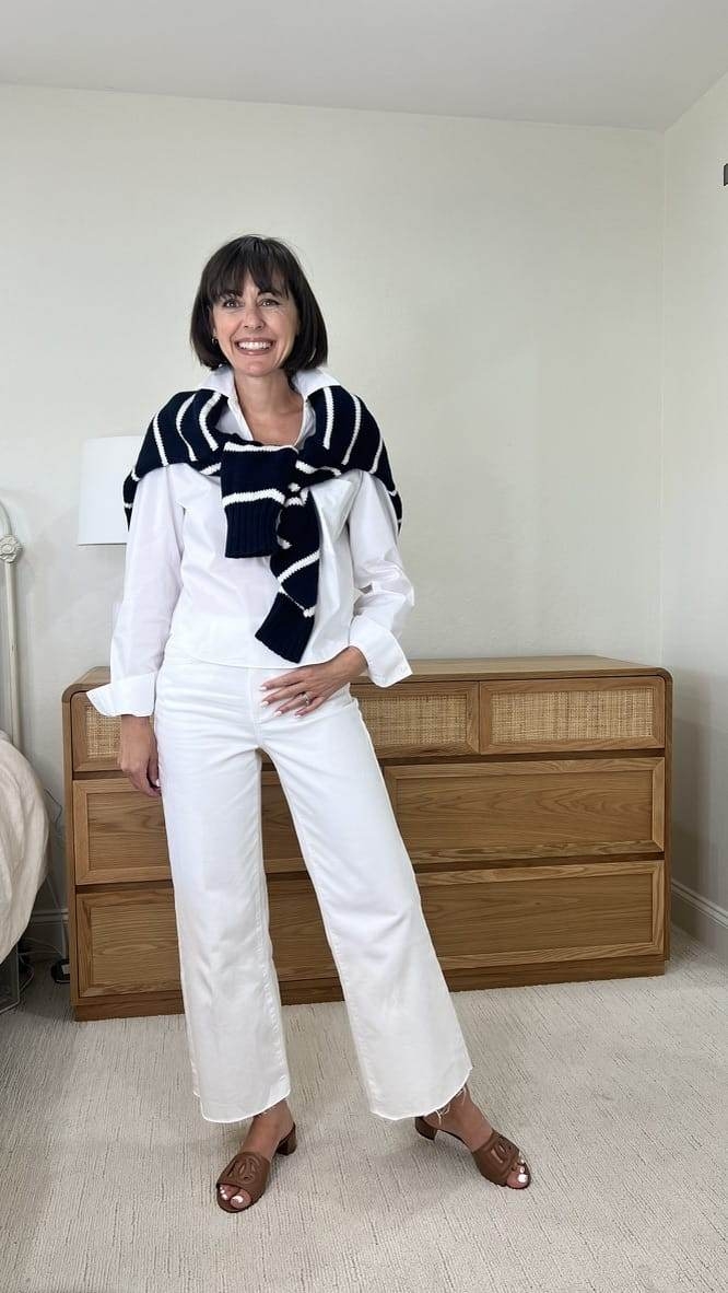 Jenni Kayne has always been one of my favorite luxe sweater brands. Her Cashmere Cocoon Cardigan and classic Fisherman Pullover have a celebrity cult following. This cozy cotton pullover is perfect! The length looks good layered over cropped pants and dresses. It also comes in ivory with a navy stripe. I’d wear this one all year long!