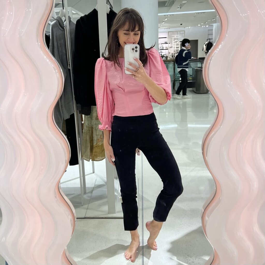 These from BLANKNYC fit similarly to the Good American style. There are some contemporary styles that are more fitted and taper or are tight around the ankle. I wear my long blazer with Spanx leggings when I travel for work. Score some Spanx faux leather leggings in petite or plus sizes too.