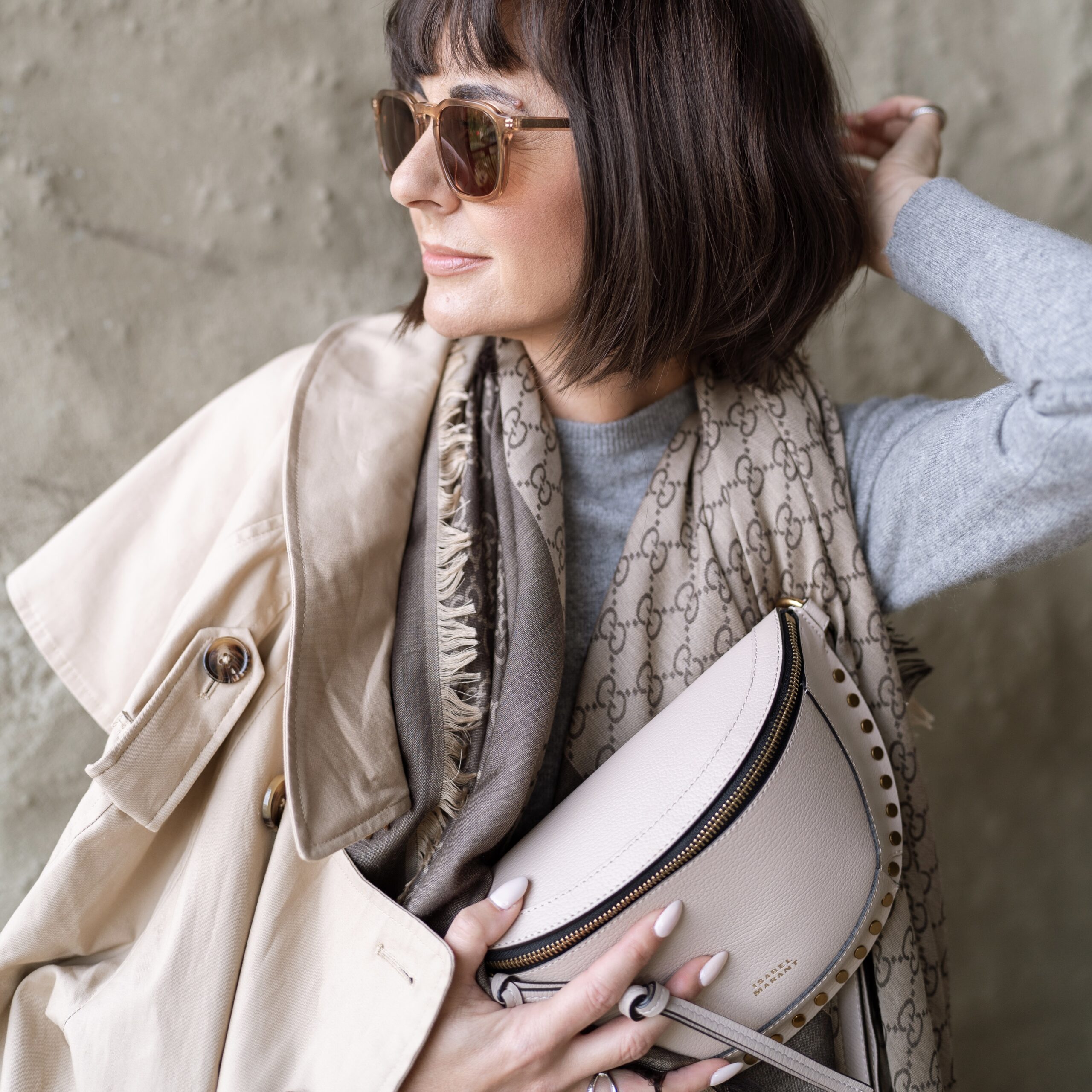 It doesn’t matter if its going to be hot or cold I always travel with a scarf. A large square is the most versatile because you can style it in so many ways. My travel looks include a high-low mix of brands. I’m taking a large neutral Gucci monogram scarf and a 29.5″ square navy blue Dior.