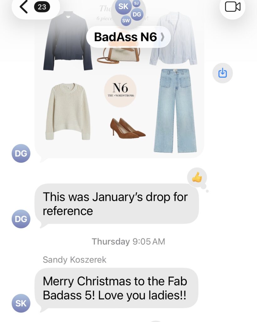 Our group chat is called BadassN6 for a reason. We’re all over 45, still active in the fashion industry, and we take helping you get dressed very seriously. Together, we bring over 100 years of experience working at Nordstrom—from personal shopping floors to buying offices. From California to Maryland, it was a pandemic that brought us together, and nothing can keep us apart. Resolve to dress better in 2026—starting the first of every month with our drop. We’ll handle the rest.