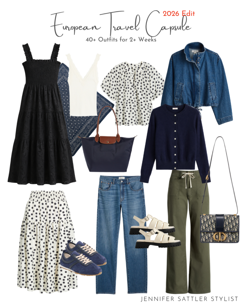 I recently remade this European Travel Capsule with two Calson pieces. The original checklist included a white skirt and top, but this polka dot duo is fun and versatile.
